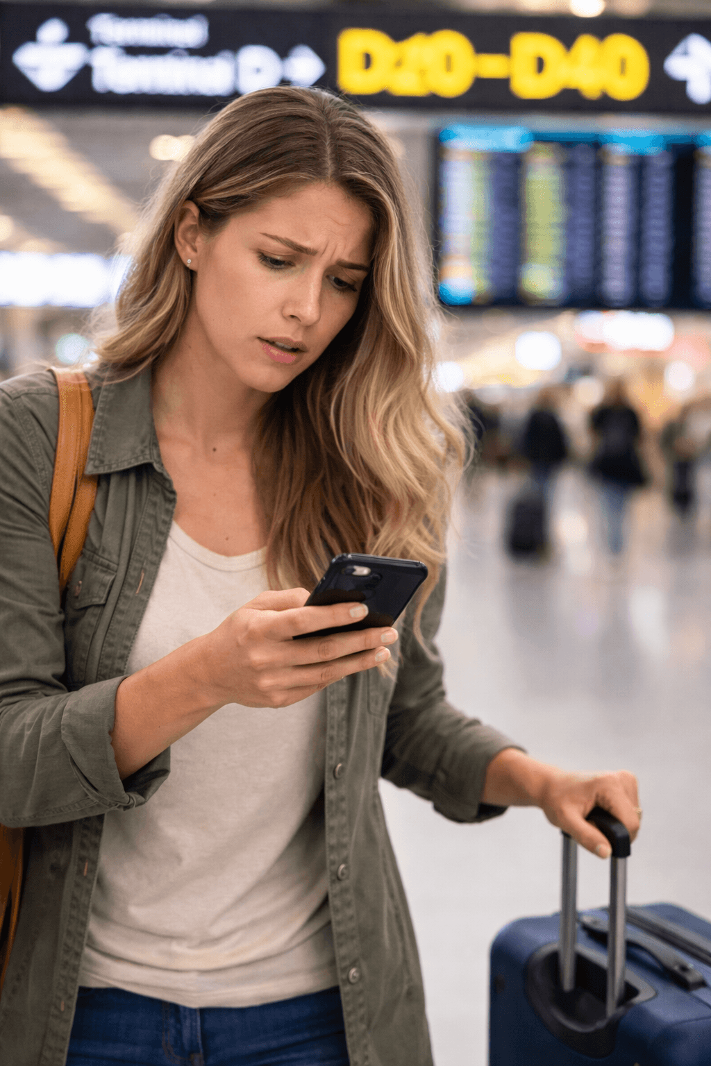 Countdown, gate, terminal, and critical flight information, with two explicit actions: